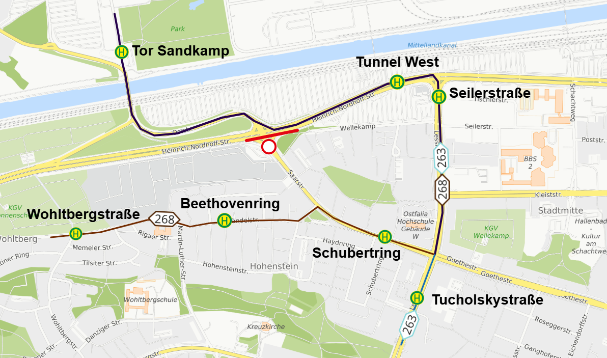 Aufgrund von Bauarbeiten auf der Heinrich-Nordhoff-Straße müssen die Linien 263 und 268 bis auf Weiteres umgeleitet werden.