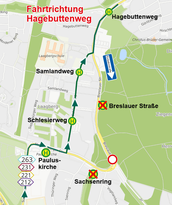 Aufgrund von Baumfällarbeiten können im Zeitraum vom 23. Februar bis 25. Februar 2026 die oben genannten Linien die Haltestellen „Sachsenring“ und „Breslauer Straße“ in Fahrtrichtung „Hagebuttenweg“ nicht bedienen.