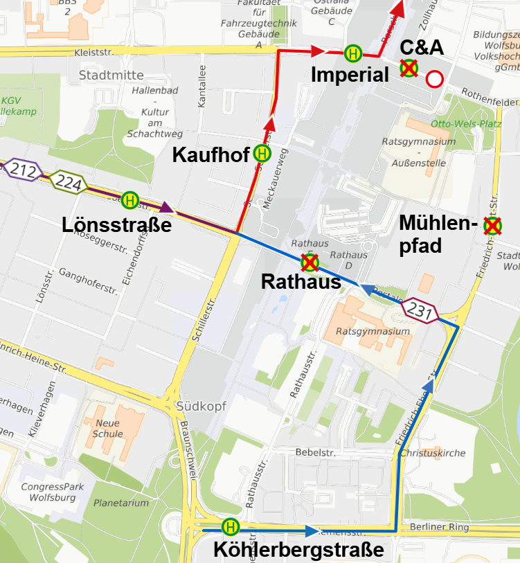 Die Haltestellen “Rathaus”, “Mühlenpfad” und “C&A” entfallen für die genannten Linien während des Baustellenzeitraums. Alternativ werden die Haltestellen “Kaufhof” und “Imperial” bedient.